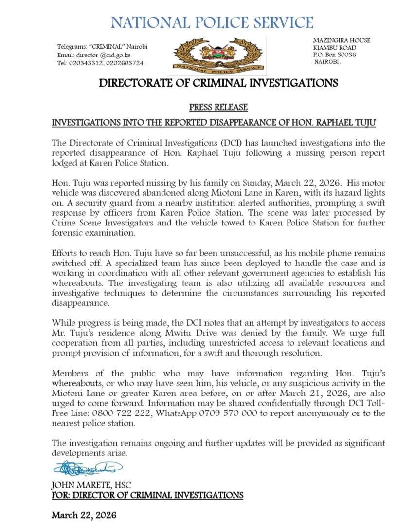 Authorities confirmed that a missing person report was filed by Tuju’s family at Karen Police Station on Sunday, March 22, triggering a formal probe into the circumstances surrounding his disappearance.